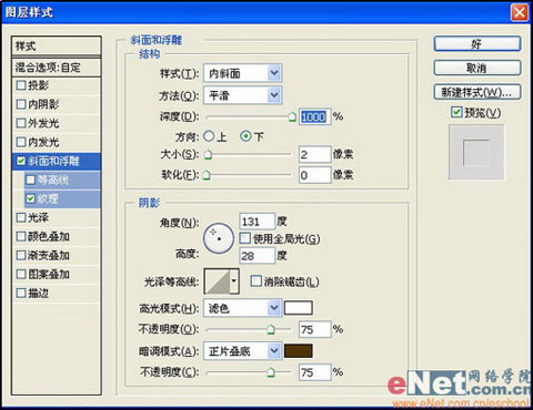 8、单击“添加图层样式”按钮,在弹出的下拉列表中选择“斜面和浮雕”命令,设置弹出的对话框如图08所示。在对话框中选择“纹理”选项,设置其对话框如图09所示,得到效果如图10所示。