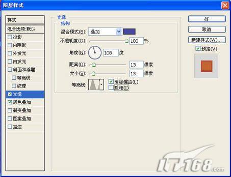 6、单击图层面板下方的“添加图层样式”按钮,在弹出的菜单中选择“光泽”命令,在弹出的对话框中,在混合模式中选择“叠加”,将叠加颜色设置为蓝色,其RGB设置为70、72、158,不透明度设置为100,角度为108,距离为13,大小为13,在等高线下拉列表中选择环形,勾选消除锯齿,不勾选反相,如图06所示。