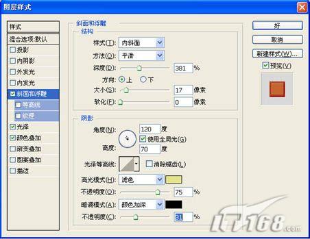 7、单击图层面板下方的“添加图层样式”按钮,在弹出的菜单中选择“斜面和浮雕”命令,在弹出的对话框中,将深度设置为381,大小为17,高度为70,高光颜色设置为黄色,高光模式的不透明度设置为100,暗调模式设置为颜色加深,其不透明度为31,效果如图07。