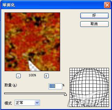10、执行菜单栏中的“滤镜”“扭曲”“球面化”命令,在弹出的球面化对话框中,将数量设置为100,效果如图10所示,单击好,最终效果如图11所示。