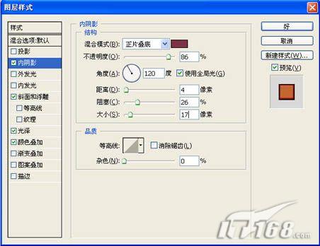 8、单击图层面板下方的“添加图层样式”按钮,在弹出的菜单中选择“内阴影”命令,在弹出的对话框中,将暗调颜色设置为深红色,其RGB的值分别为127、51、68,不透明度为86,距离为4,阻塞为26,大小为17,如图08所示。