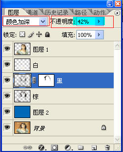 4、将黑色图层设置为颜色加深,并调节其透明度,力求使整个头发的颜色接近原图;此时,我们仔细看,会发现抠出的人物主体和滤镜抽出的图层结合部位,会有颜色深浅不融合的现象;
