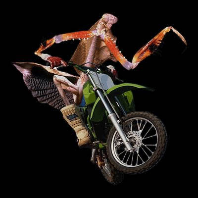 螳螂要想骑上摩托车可不是一件容易的事,原有的肢体结构还有许多不协调的地方,所以必须把螳螂的各个部位进行重新组装,卸胳膊、卸腿、扭腰、移翅,享受作上帝的痛快吧!