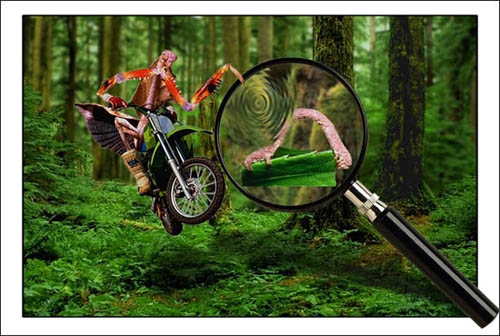 接下去根据草图所勾画的5个元素(螳螂、摩托车、害虫、放大镜、森林背景),又开始找相应的图片,在找图过程中,不必过于苛求,否则你会坚持不了一天就会跟创意说再见!而且不要忘了,Photoshop使你不再受传统暗房的限制,你可以改变一切,而且非常轻松!
