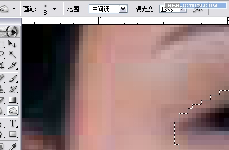 4.加深后可以取消选区查看效果,如果不满意可以CTRL Z返回选区再处理,自己看满意后,CTRL SHIFT I反选,准备做双眼皮的高光。我们选择减淡工具,也沿着选区的边沿实施减淡,涂出高光。