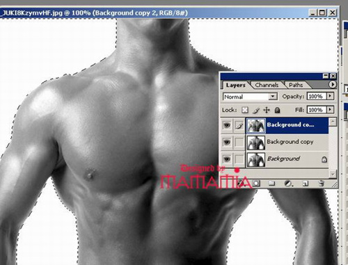 1.首先,素材2号是我选择的人体图片,先用色阶把光暗调好,先把这层存档,要存PSD档,后用通道把人体扣出,不要白色背景,复制2层
