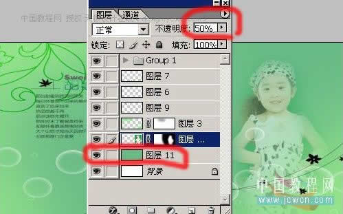 6 在背景层的上层 人物层的下层填充一种接近人物层绿色的颜色。可以用吸管吸取人物层上的绿色然后填充。并且把人物层改不透明度。改为多少就看你想要的效果了。