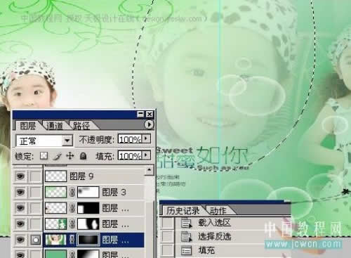 8 刚才在白色上面加了一层绿。。现在我们在绿色层上加蒙板,然后拉渐变。。这样背景层的白色就显示出来了。然后回到人物层,也加蒙板 拉渐变和模板。 现在已经融合了,但人物脸部有上一层的颜色--绿色。
