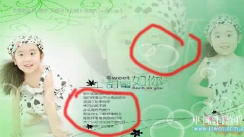 13 现在基本完成了,但模板上的修饰还有一点不合适,比如 泡泡在人脸部了,下面的小字体不适合儿童等等。 修饰一下就可以完工了。你可以把模板上的修饰去掉,然后加新的,也可以在这个基础上重新排列他们的位置。