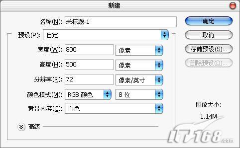 首先运行Photoshop,新建一个800x500像素,72dpi的RGB图像。如图1所示。