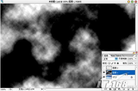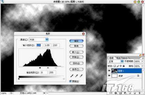新建图层1,执行滤镜/渲染/云彩,紧接着按下Ctrl L打开色阶调板,对图层1进行调整。如图2所示。