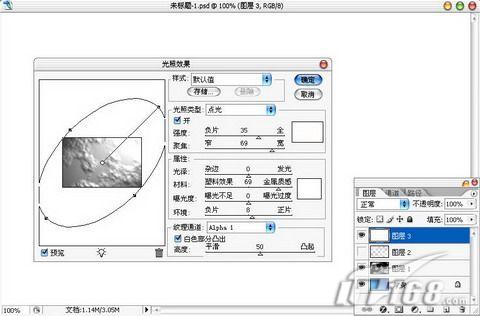 回到图层面版,新建图层3并且填充白色。接着执行滤镜/渲染/光照效果,将纹理通道设置为Alpha1通道,其它设置保持默认即可,单击确定按钮应用滤镜。如图8所示