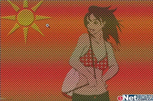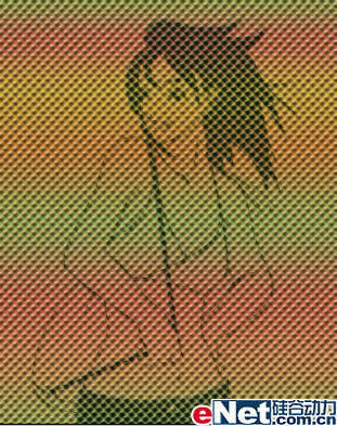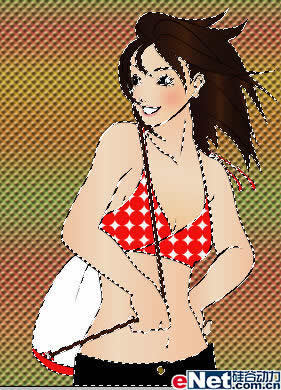 6、新建一层,选择一个图案文件拖拽到文件中。选择工具箱中的“魔棒工具”,在人物的黑色部分单击,选取所有的黑色部分,然后选择花纹图层,按Ctrl C和Ctrl V键拷贝粘贴到一个新的图层,并依次将不同颜色分别做此操作。
