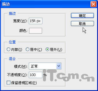 第二步:单击菜单栏中的“编辑→描边”命令,打开的“描边”对话框,设置好其中的参数,如图2所示。