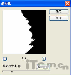 第四步:接着设置前景色为黑色,背景色为白色,并按Ctrl Delele键填充选区。然后再单击菜单栏中的“滤镜→像素化→晶格化”命令,设置好“单元格大小”参数,如图4所示。