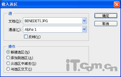 第五步:返回到图层面板,选中图层1。选择菜单栏中的“选择→载入选区”命令,在“载入选区”对话框中的“通道”下拉列表中选择“Alpha1”,如图5所示。