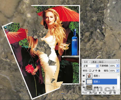 第七步:创建一个图层——图层2,并将其移动到图层1的下方。然后使用工具箱中的“套索工具”,并在其属性工具栏中单击“从选区减去”按钮,然后保留图像撕裂的边缘,将**部分选区去掉,如图7所示。