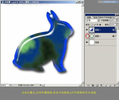 点击红圈处,关闭手镯图层,然后双击图层2,打开图层样式对话框。