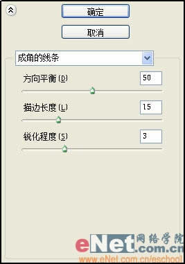 紧接着再执行滤镜/画笔描边/成角的线条,将方向平衡设置为50,描边长度设置为15,锐化程度设置为3,单击确定按钮。