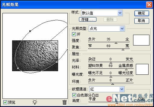 继续执行滤镜/渲染/光照效果,将光照区域调整为如图所示的位置,另外将“纹理通道”项设置为“红”,**内容保持默认设置不变即可。