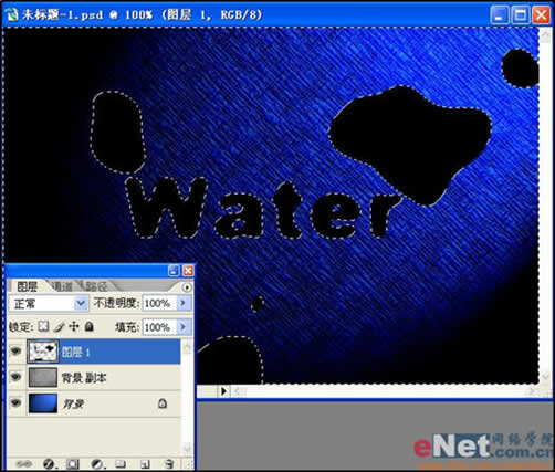 背景的制作就告一段落了。接着选择文字输入工具输入文字“Water”并将文字设置为黑色。在文字图层下方建立图层1并填充白色。选中图层1进行操作,执行滤镜/渲染/云彩,如果效果不合适可以反复按下Ctrl F来执行云彩滤镜,直到满意为止。