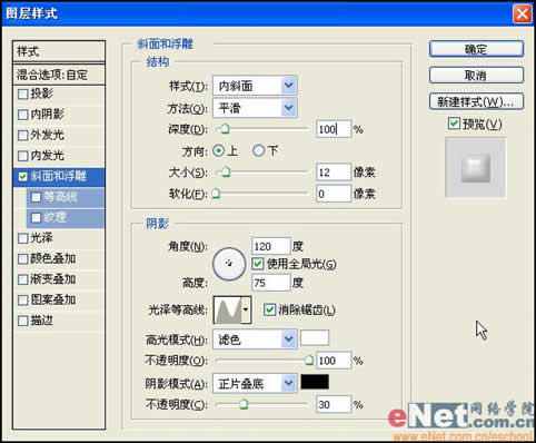 再次执行滤镜/模糊/高斯模糊,将模糊半径设置为1像素,这样使文字更加柔和。接着将图层1的填充度设置为0%,这样就在画布中看不到图层1中的内容了。双击图层1打开图层样式的设置界面,首先添加“斜面和浮雕”样式,将深度设置为100%,大小为12像素,软化0像素,阴影角度为120,高度75度,并将光泽等高线设置为如图所示的样式,**设置参见图片。