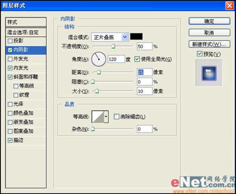添加内阴影样式。不透明度设置为50%,距离为15像素,大小10像素。