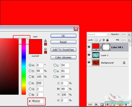 在弹出的拾色器中选红色(不用太精确,一会儿还要调)。