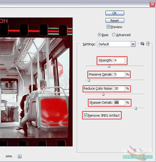 第十步:滤镜--杂色--减少杂色(貌似有些版本的叫"去除杂色"),参数如下: