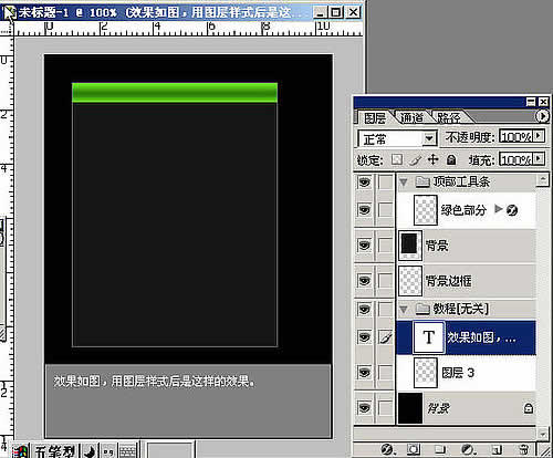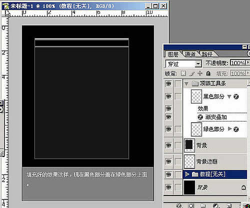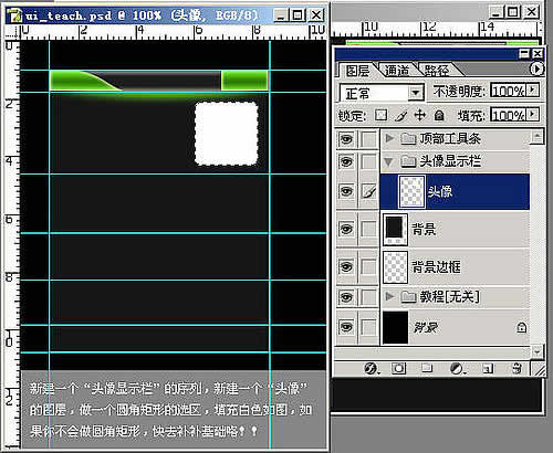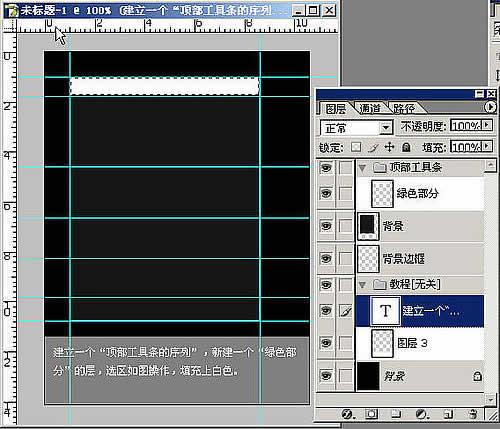 4、建立一个“顶部工具条”的序列,在这个序列中新建一个图层,命名“绿色部分”,选取如图矩形框,填充上白色。