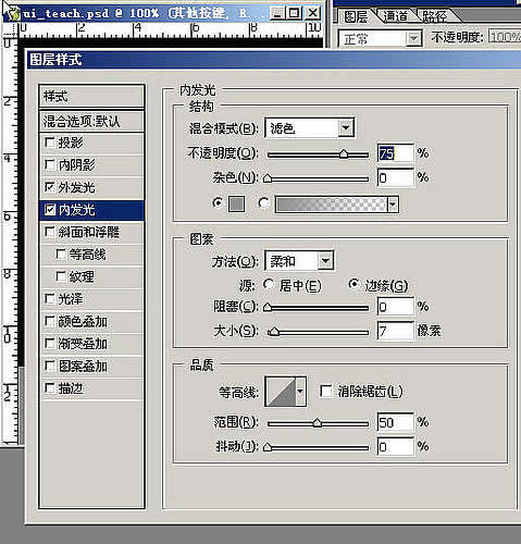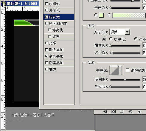 10、按ctrl+enter 把路径转变为选区,按delete 删除选区内容,可以给左边角绿色的部分加上“内发光”效果,如图。然后用同样的方法完成右边角的制作。