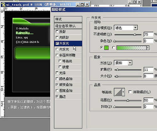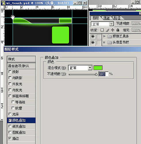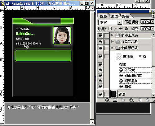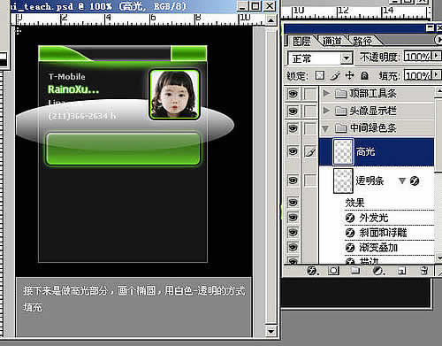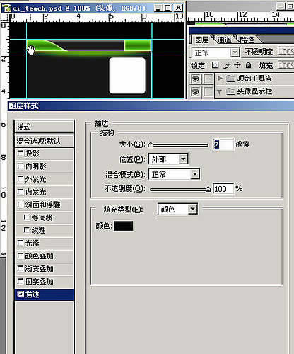 17、下面讲讲中间的水晶条的制作。建立“中间绿色条”序列,新建一个图层,创建圆角矩形选区,填充白色,然后对这个图层添加图层式样,包括边框、阴影和过渡色的制作。