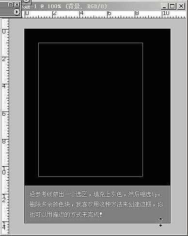 2、新建一个图层,沿参考线做一个选区,填充上灰色,然后缩选1px,删除多余的色块,创建出边框;也可以用描边的方式来完成。