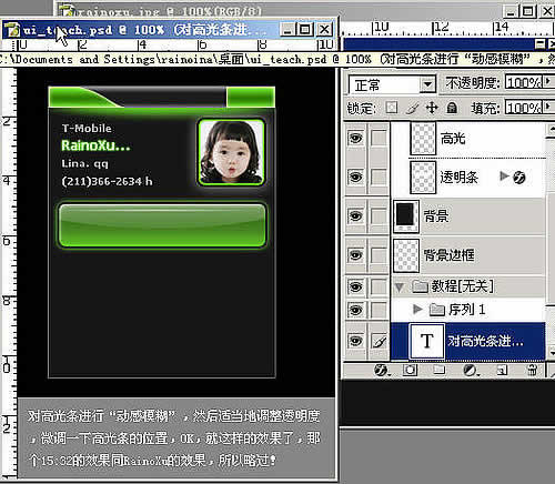 21、接下来再做一个条形高光。新建一个图层,取名“高光条”,画一个很细的长椭圆,填充白色,再对其进行“动感模糊”,适当调整位置及透明度即可。