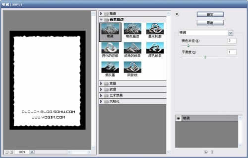 使用矩形选框工具选择上下左右的中间部分(注意不要对称,只选择部分),使用滤镜-画笔描边-喷溅。喷色半径3,平滑度7。