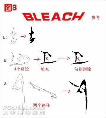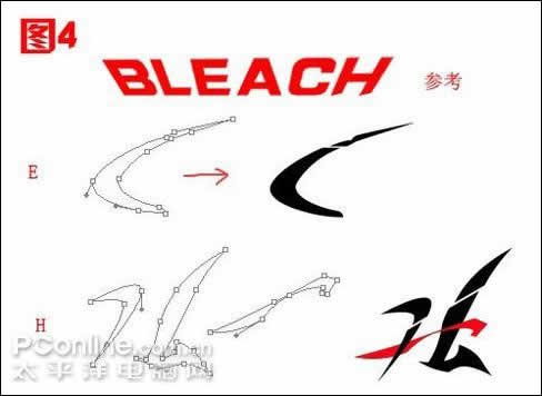 在新建的A4文件内先用随便一种字体输入漫画的英文标题"BLEACH",然后将其"删格化图层",CTRL T调整到合适的姿态做个鼠绘的参考。