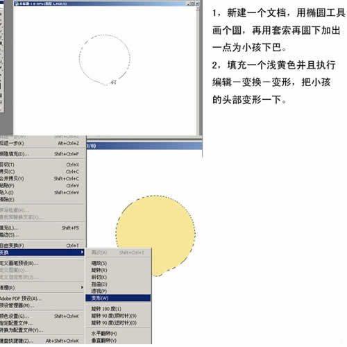 2. 填充一个浅黄色并且执行编辑—变换—变形,把小孩的头部变形一下。
