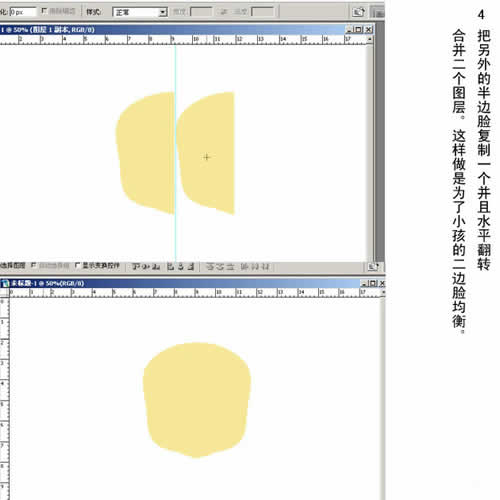 4. 把另外的半边脸复制一个并且水平翻转合并二个图层。这样做是为了让小孩的两边脸均衡。
