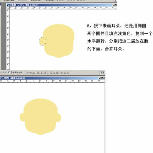 5. 接下来画耳朵,还是用椭圆画个圆并且填充浅黄色,复制一个水平翻转,分别把这两层放在脸的下面,合并耳朵。