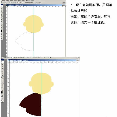 6. 现在开始画衣服,用钢笔贴着标尺线,画出小孩的半边衣服,转换选区,填充一个暗红色。