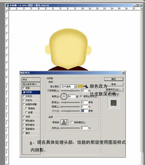 8. 现在具体处理头部,给脸的那层使用图层样式内阴影。