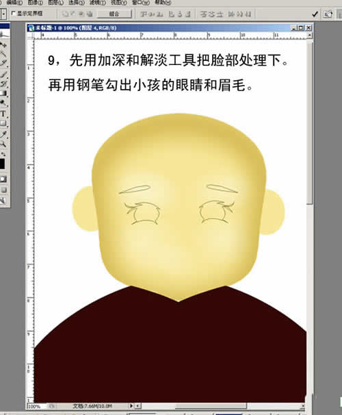 9. 先用加深和减淡工具把脸部处理下。再用钢笔勾出小孩的眼睛和眉毛。