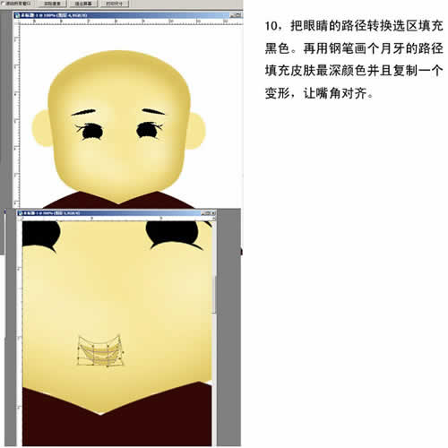 10. 把眼睛的路径转换选区填充黑色。再用钢笔画个月牙的路径填充皮肤最深颜色并且复制一个变形,让嘴角对齐。