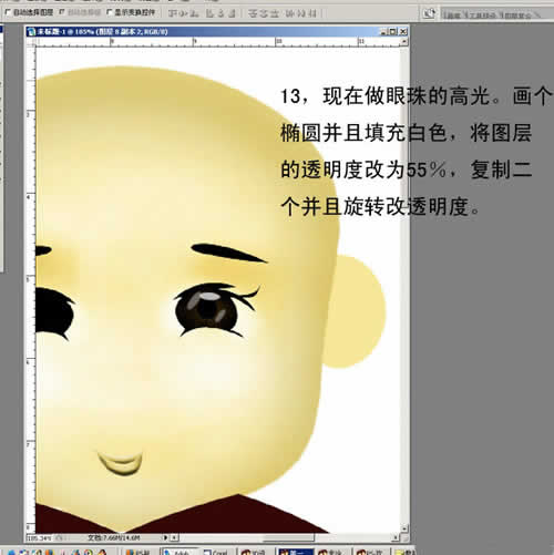 13. 现在做眼珠的高光。画个椭圆并且填充白色,将图层的透明度改为55%,复制两个并且旋转改透明度。