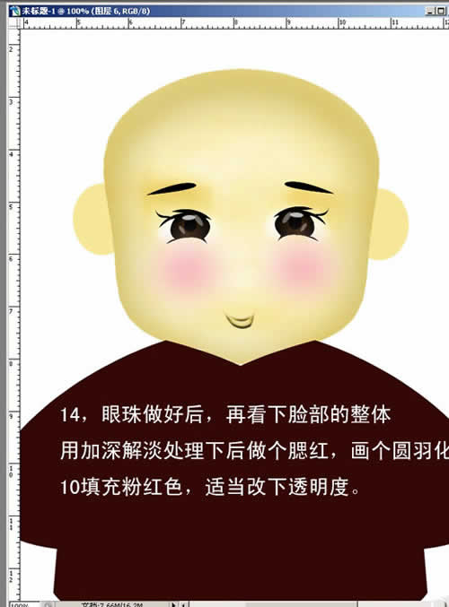 14. 眼珠做好后,再看下脸部的整体用加深减淡处理下后做个腮红,画个圆羽化10填充粉红色,适当改下透明度。