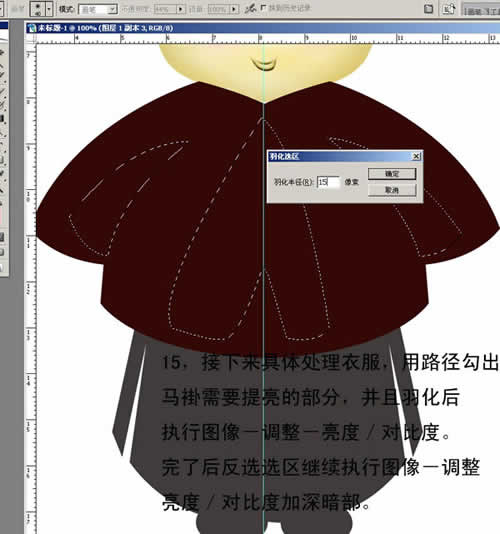 15. 接下来具体处理衣服,用路径勾出马褂需要提亮的部分,并且羽化后执行图像—调整—亮度/对比度。完了后反选选区继续执行图像—调整—亮度/对比度加深暗部。
