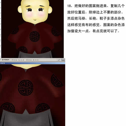 18. 把做好的图案拖进来,复制几个放好位置后,除掉边上不要的部分,然后把马褂,长袍,鞋子多添点杂色,这样感觉有布的感觉。图案的杂色添加值设大一点,有点亮就可以了。