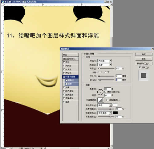 11. 给嘴巴加个图层样式斜面和浮雕。