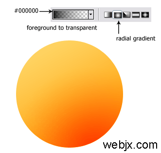 创建一个图层,然后按CTRL键单击圆,再选择新建立的图层,然后使用渐变工具,设置前景色为#000000 (黑色),选择径向渐变,然后设置由黑色到透明色的渐变颜色,从下面2/3到顶部进行拖拽鼠标,改变图层模式为叠加。
