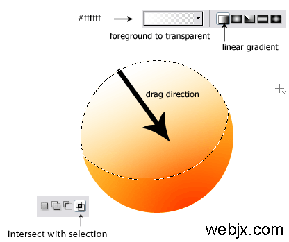 再创建一个新图层,设置前景色为#ffffff,按Ctrl键单击圆图层,然后使用选区的交叉选项调整选区的形状。然后设置渐变方式进行渐变填充,不透明度降低到50%。